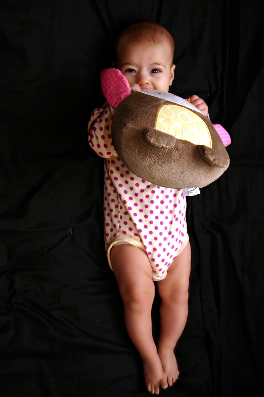 Extra Comments: You love waving and saying hi to people when we are out, and about and people love saying hi to you. You have become ticklish under the armpits and chin and giggle nonstop, which is so cute. Taking after your Daddy you like to play "golf" with your rattle and the cats toy ball, hitting the ball with the rattle all around the living room. One of your favorite games while eating is pretending to feed Mommy and Daddy. You put the food up to our mouths, sometimes in our mouth, then take the food away last minute and feed it to yourself, you get the biggest kick out of this. One of your favorite toys to play with and kiss is Meeko, you love your new friend. On 5-7 you bit Mommy for the first time on the arm, not once but twice, that's all it took was the second time.